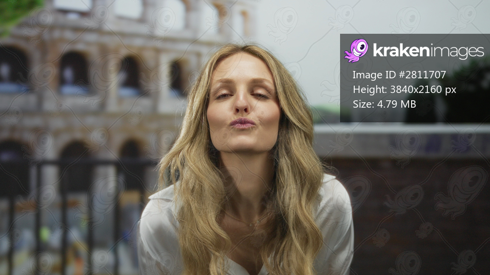 Portrait of a confident woman lips blowing salute before ancient coliseum roman blonde explorer posing amidst busy outdoors street heart shape moment.