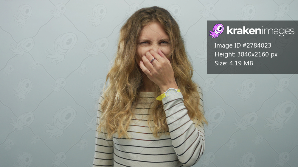 Portrait of woman with nose pinch reaction in studio showing disgust blonde young emotions against a striped shirt and watch.