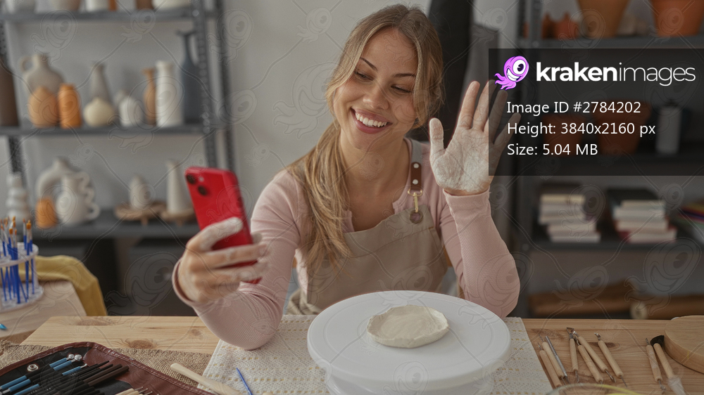Potter wearing apron waves hand to smartphone in pottery studio; friendship connection creativity joy.