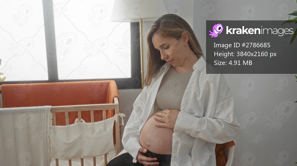 Pregnant blonde woman sits in cozy baby room holding belly, surrounded by bright decor and natural light, reflecting maternal anticipation and warmth.