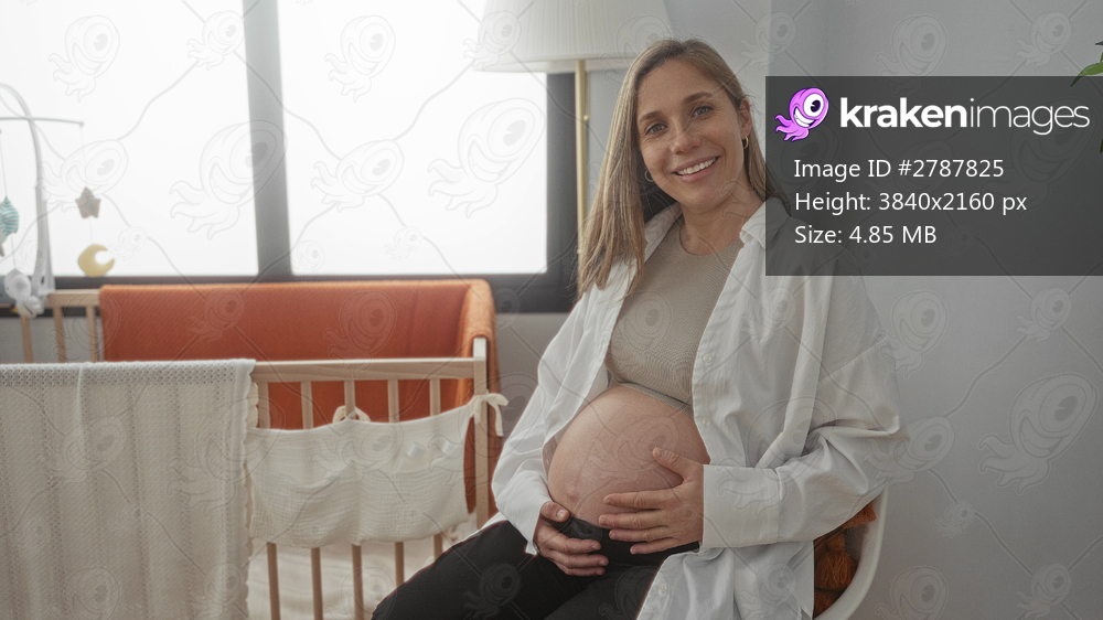 Pregnant blonde woman sits in cozy baby room holding belly, surrounded by bright decor and natural light, reflecting maternal anticipation and warmth.
