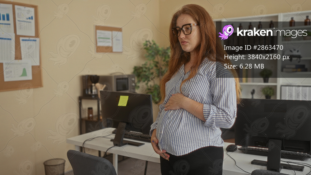 Pregnant caucasian woman with glasses touches bare belly at her desk in office building surrounded by computer screens and files; maternal anticipation hope serenity. - Kraken Images
