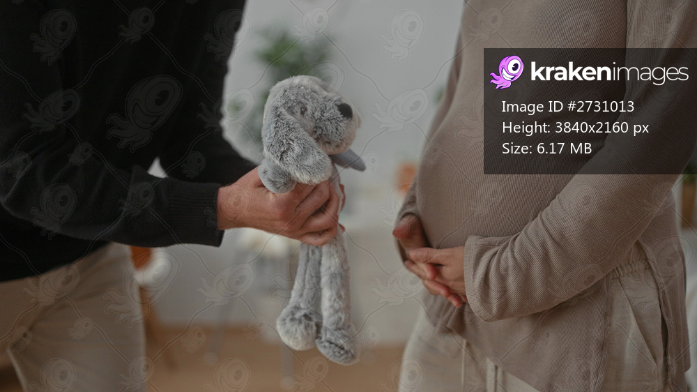 Pregnant couple joyfully interacting in a baby room, with man gifting a stuffed toy to expecting woman near a crib.