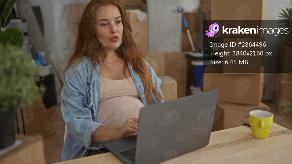 Pregnant redheaded woman touches belly while typing on laptop in building amid packed boxes; anticipation focus.