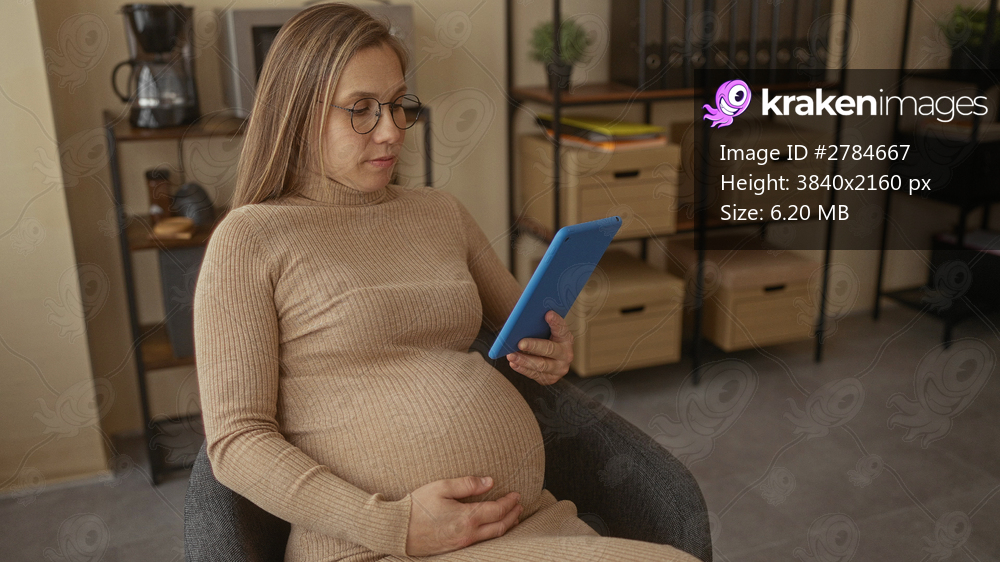 Pregnant woman with a tablet sits in a modern office surrounded by shelves and business equipment, showcasing a relaxed work environment indoors.