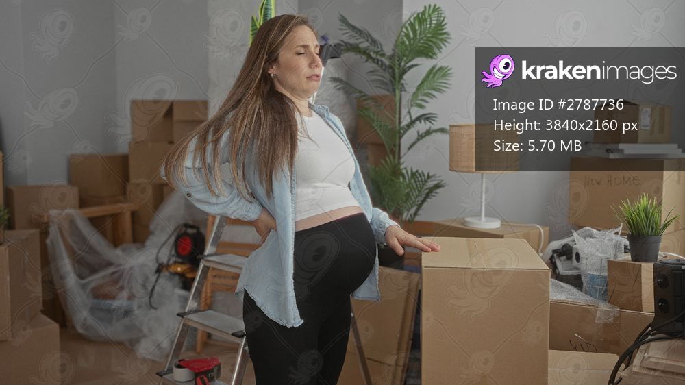 Pregnant woman arranges boxes in living room of new home, surrounded by unpacked items, embodying anticipation and homemaking in bright indoor space.