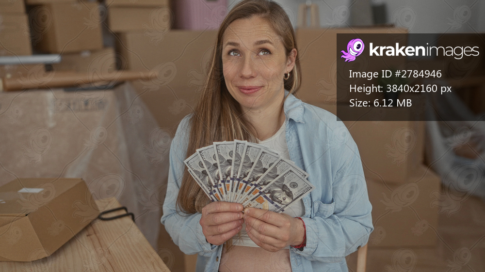 Pregnant woman with blonde hair holds us dollars indoors surrounded by moving boxes in a new home, capturing the essence of financial independence and relocation. - Kraken Images