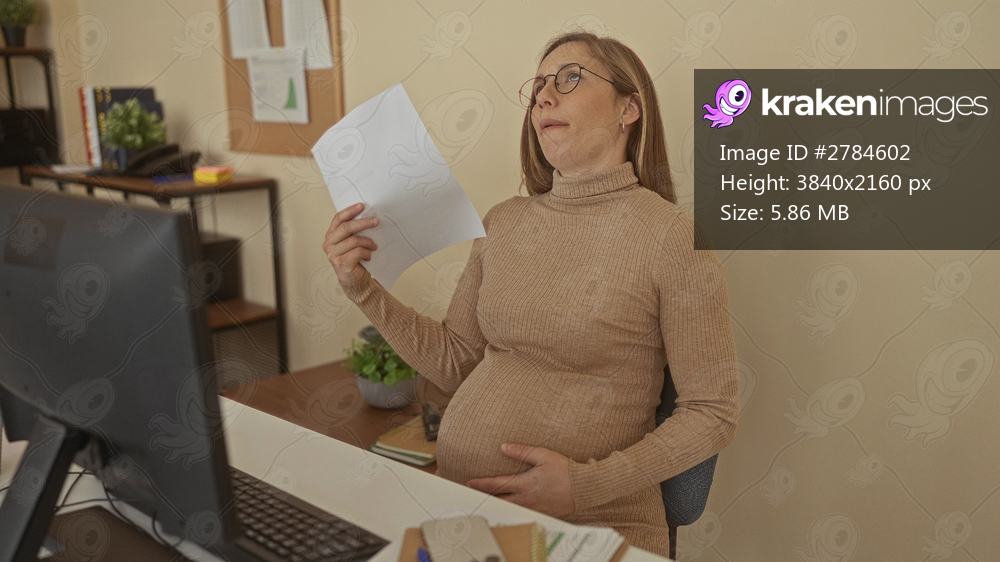 Pregnant woman with blonde hair sits in an office holding paperwork, expressing fatigue in a modern workspace with a computer and minimalistic decor.