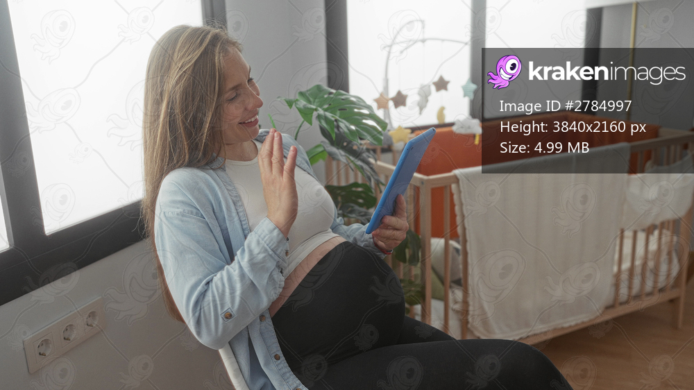 Pregnant woman caresses belly while holding tablet in nursery; anticipation bonding joy.