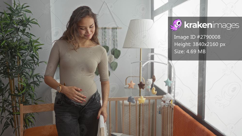 Pregnant woman gently cradling her belly in a cozy baby room, surrounded by baby crib and soft toys, capturing serene motherhood moments indoors.