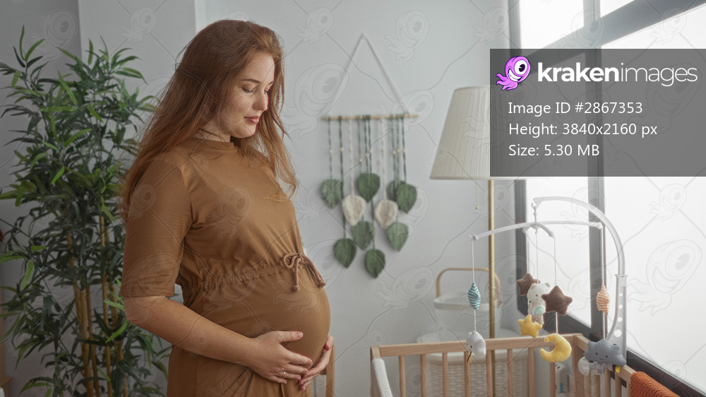 Pregnant woman gently touches belly beside crib in sunlit building; maternal love serenity anticipation.
