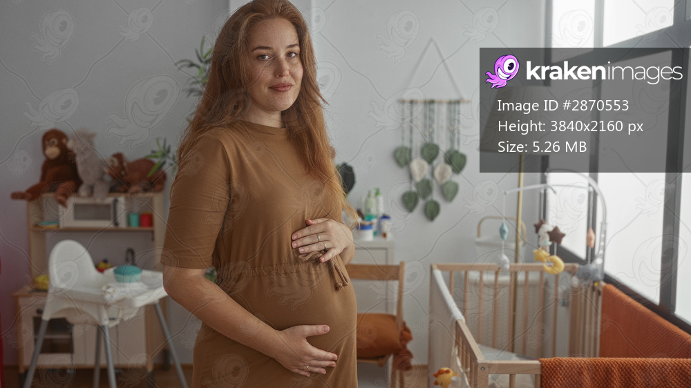Pregnant woman gently touches belly by a crib in a building next to a window and lamp under soft daylight; anticipation nurturing.