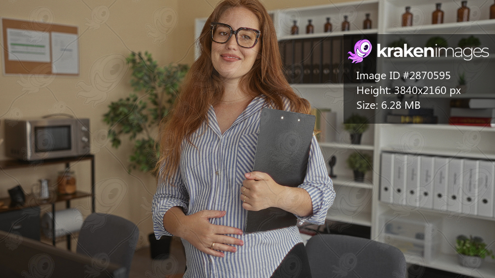 Pregnant woman gently touches her bare belly while holding a clipboard in a building; expecting new life.