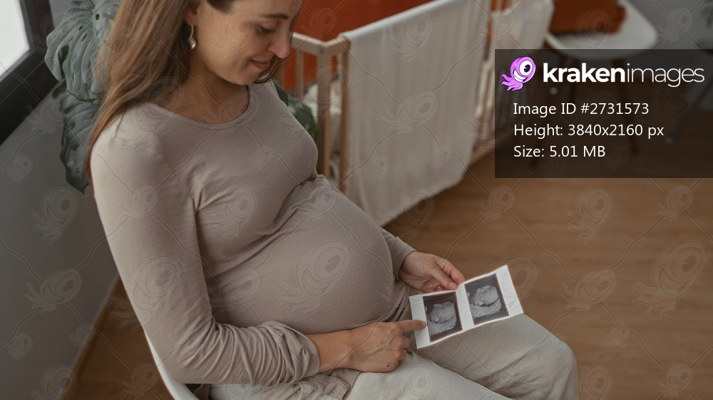 Pregnant woman holding an ultrasound image in a cozy bedroom, gently touching her belly, surrounded by soft light capturing the intimate moment.