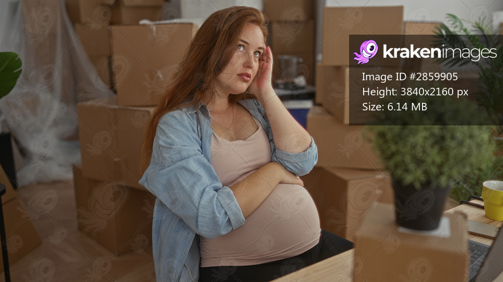 Pregnant woman holds belly and touches head inside a building filled with moving boxes; relocation stress.