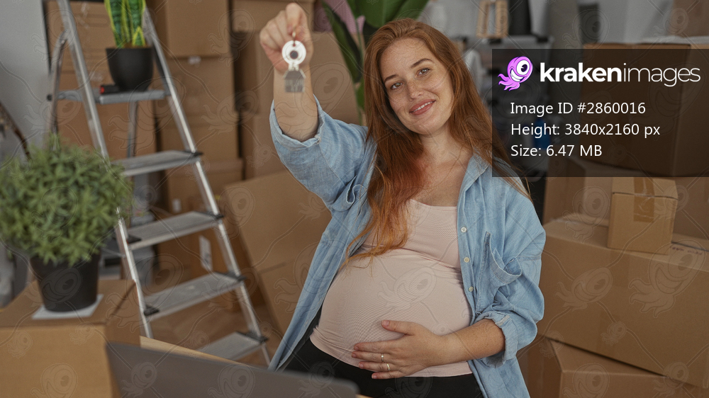 Pregnant woman holds house keys forward while cradling her bare belly in a modern home interior with moving boxes; anticipation.