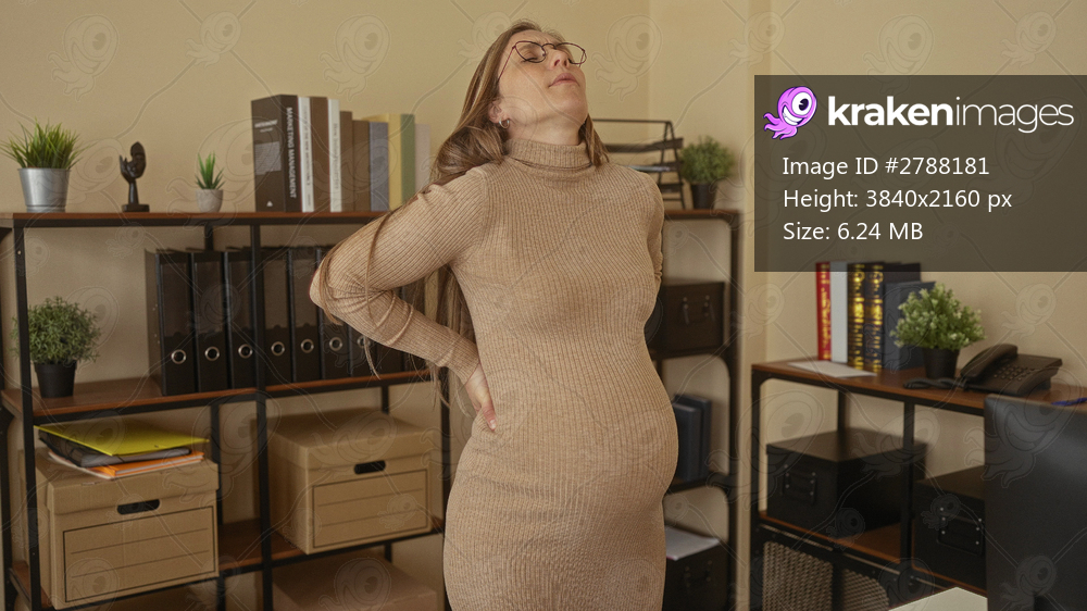 Pregnant woman holds lower back in office; backache discomfort fatigue.
