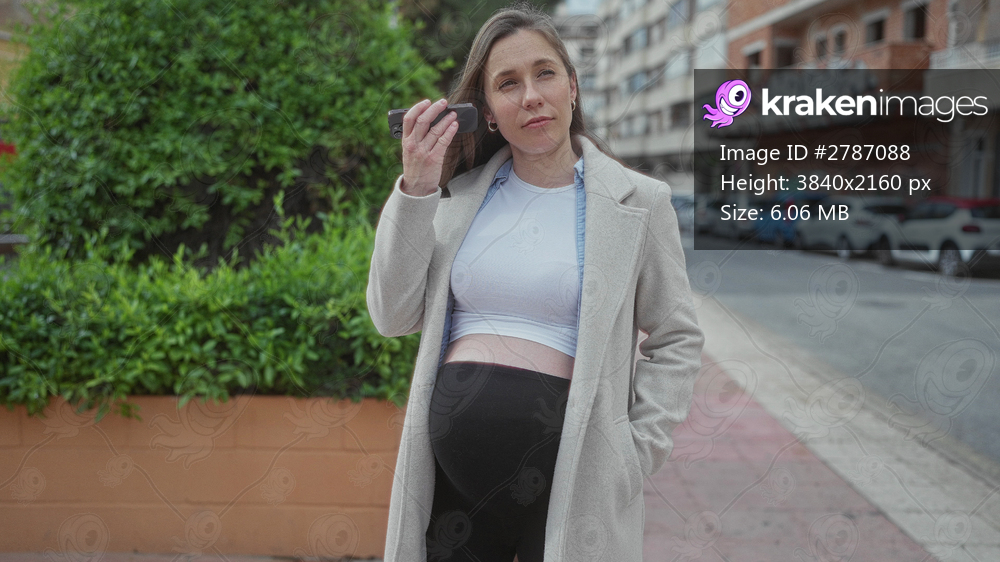 Pregnant woman holds phone on urban street with buildings and parked cars in city setting, wearing coat on cloudy day outdoors.