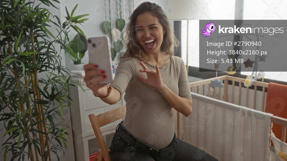 Pregnant woman holds smartphone and touches belly while smiling inside building baby room; motherhood joy.