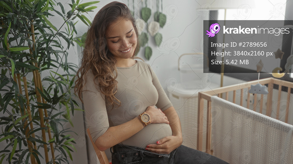 Pregnant woman in bedroom lovingly holding her belly, surrounded by a cozy crib and plants, conveying an intimate and serene atmosphere.