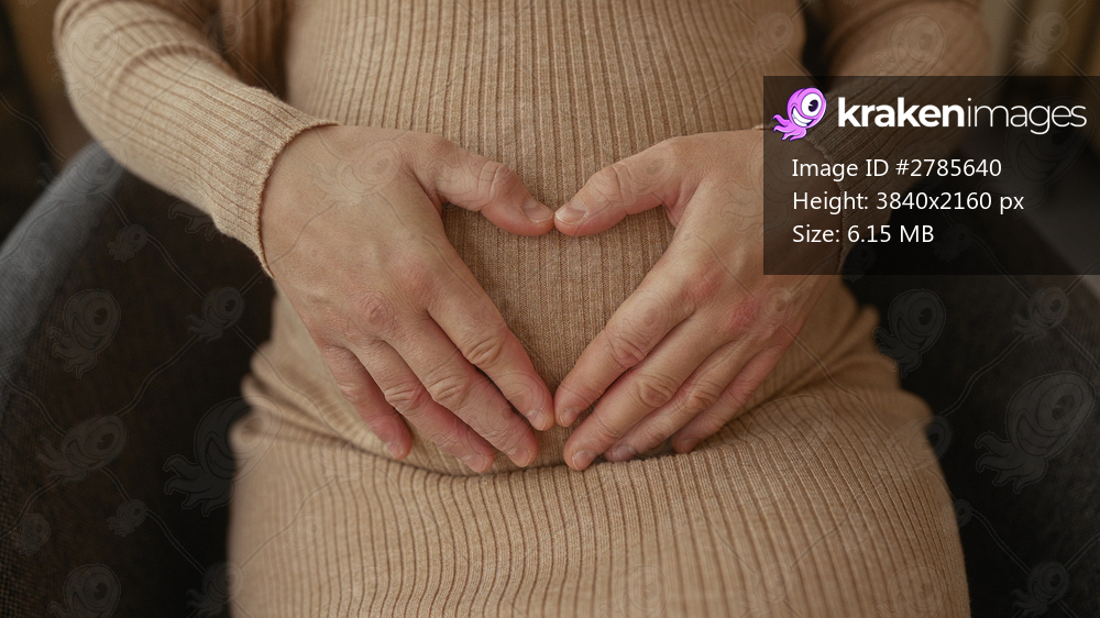 Pregnant woman in beige dress cradling her belly while sitting indoors in a cozy office, emphasizing maternal anticipation in a serene workplace setting. - Kraken Images
