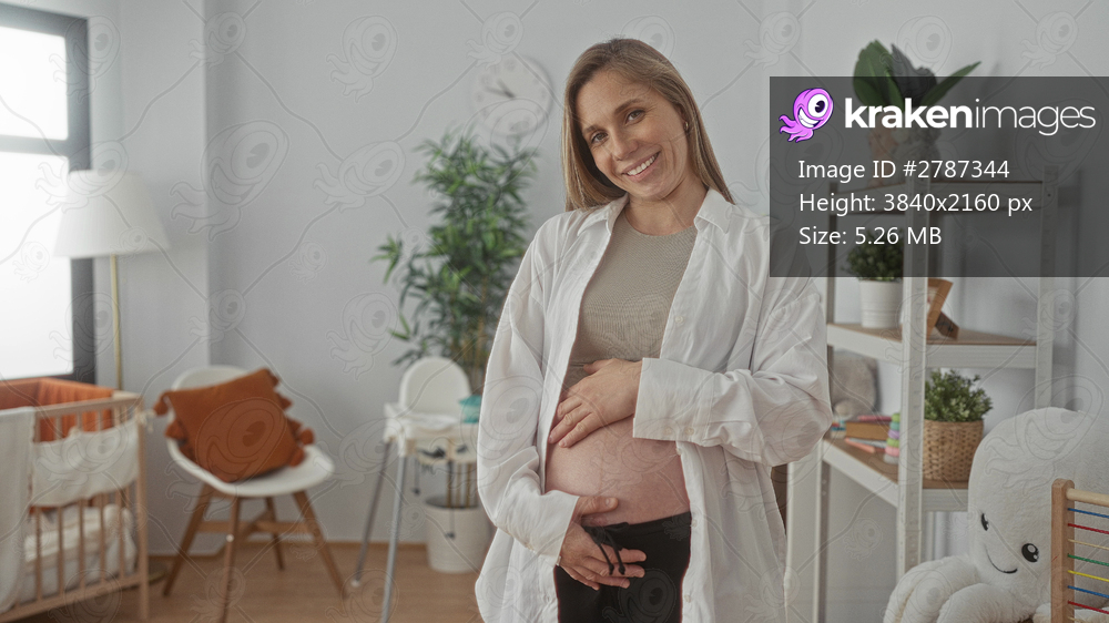 Pregnant woman in cozy baby room gently holding her belly, surrounded by nursery decor, expressing maternal anticipation in a serene home setting.