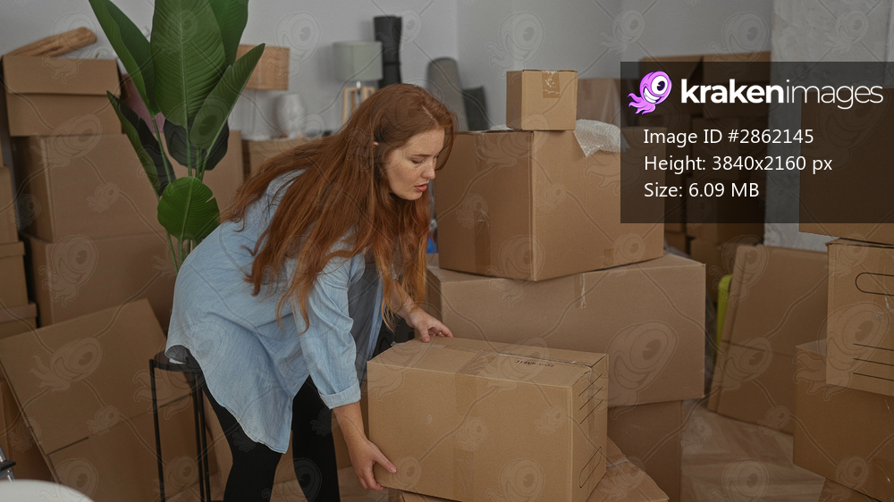 Pregnant woman lifts moving box in building surrounded by packed cardboard boxes while holding lower back for backache; discomfort.
