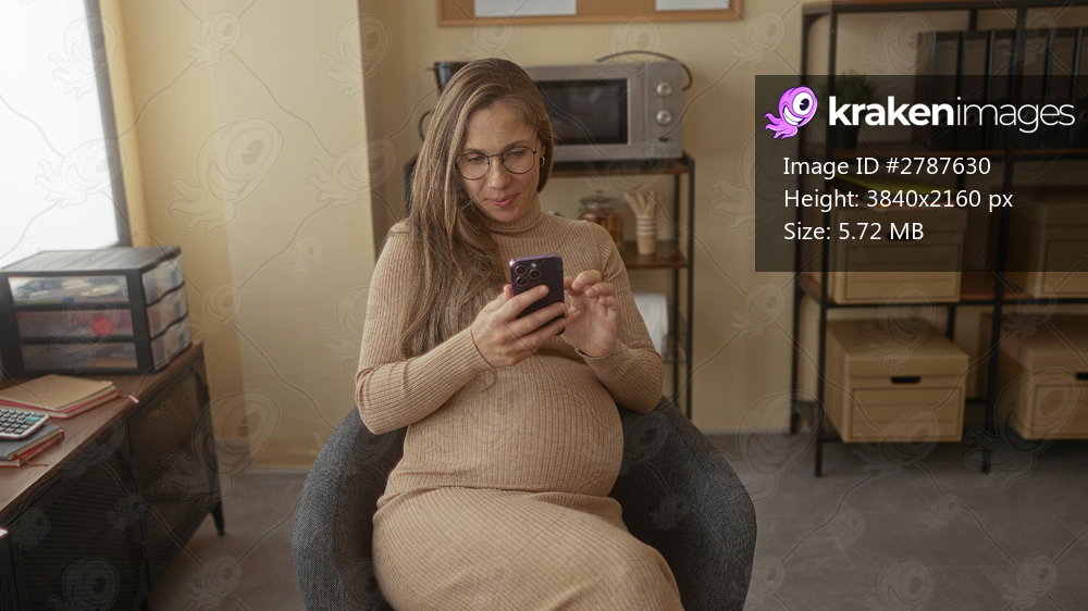 Pregnant woman with long blonde hair taking a selfie indoors while seated in an office room with shelves and a microwave in the background.