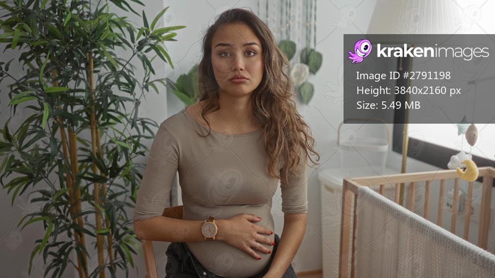 Pregnant woman with long hair sits in a cozy nursery holding her belly, surrounded by soft decor and natural light, embodying tranquility and maternal anticipation. - Kraken Images