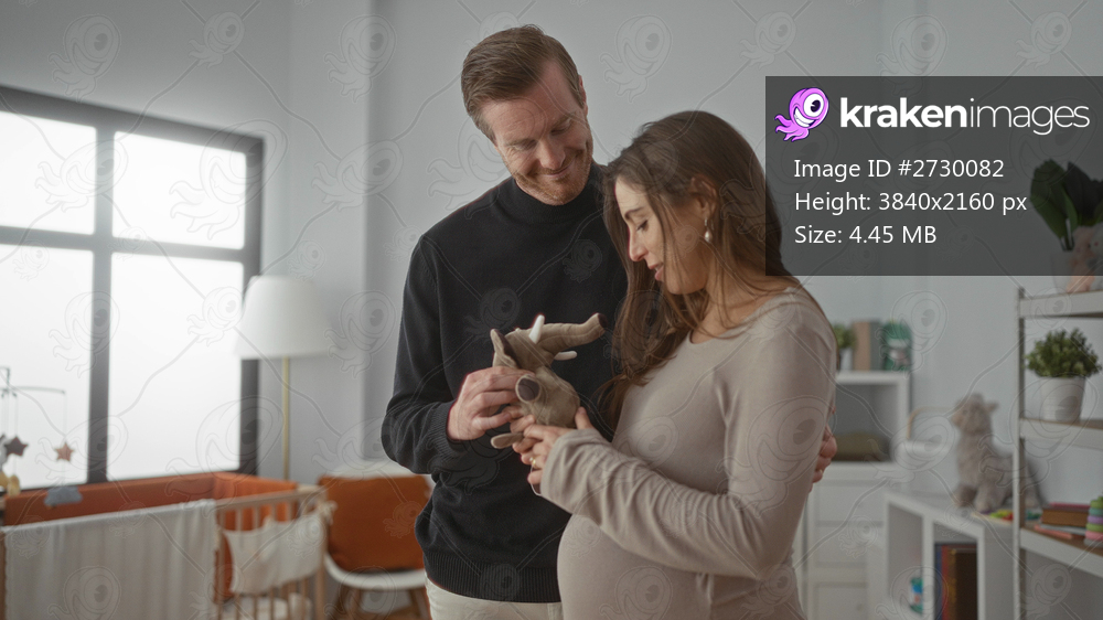 Pregnant woman and man standing in a cozy home nursery with a crib, embracing and smiling as they prepare for their baby.