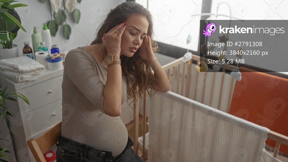 Pregnant woman pressing temple with hand while leaning against crib in quiet bedroom; physical discomfort.