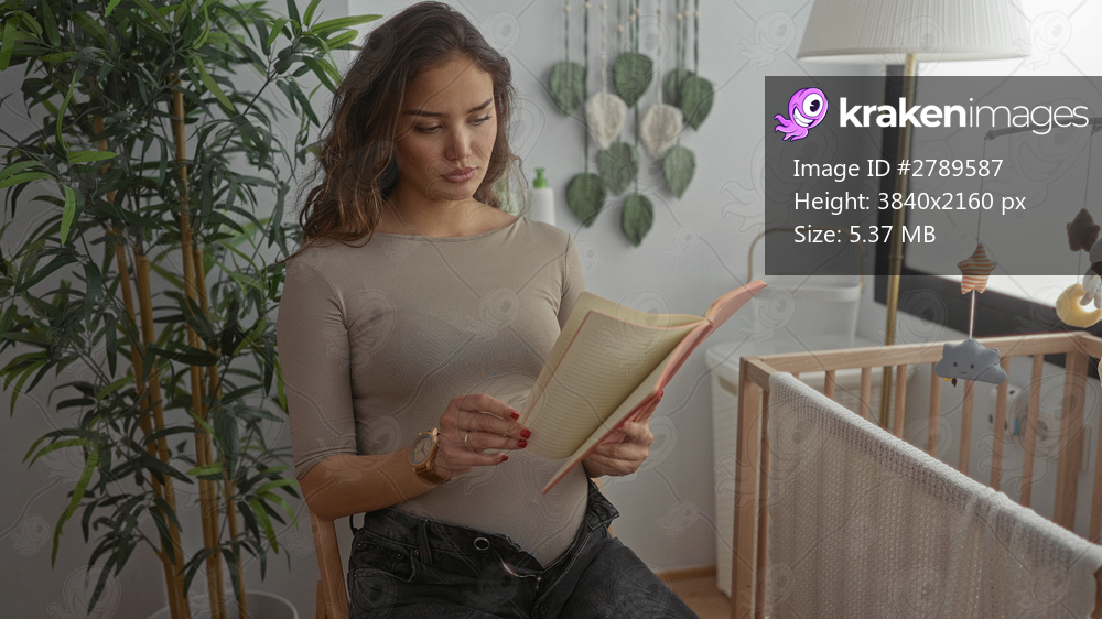 Pregnant woman reading in a cozy bedroom with a crib and decor, conveying a serene maternal atmosphere about young life and family preparation.