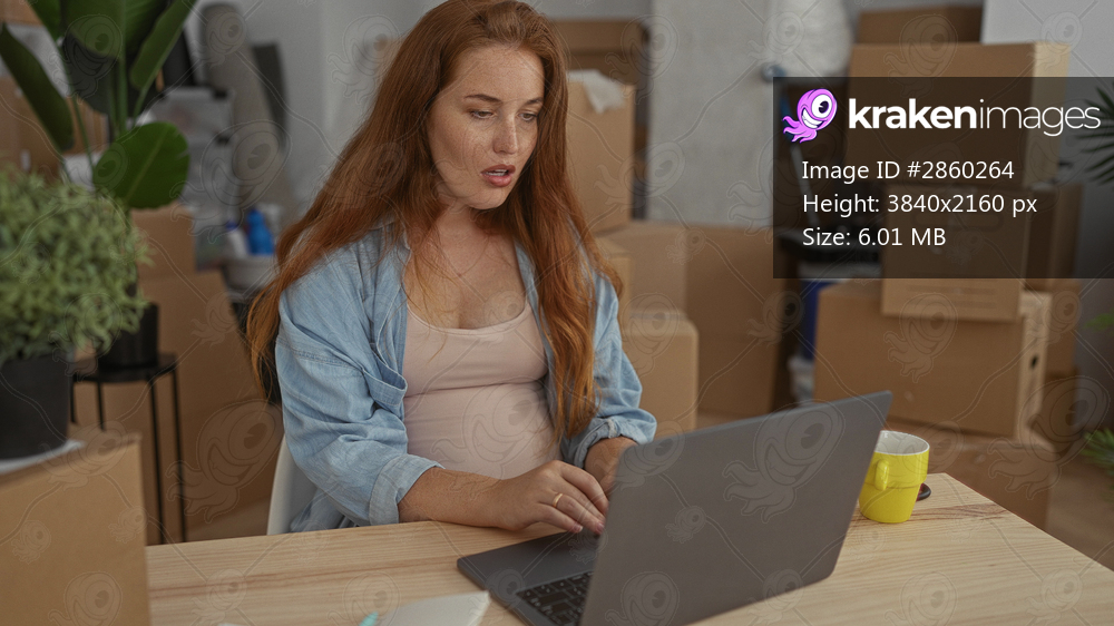 Pregnant woman shrugs hands over exposed belly in a new home surrounded by unpacked boxes; uncertainty transition.
