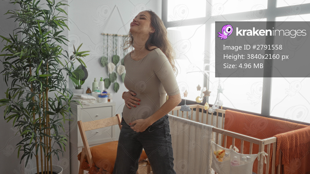 Pregnant woman smiling and dancing in a cozy baby room with a crib and plants, bathed in soft light from a large window, embodying joy and expectation. - Kraken Images