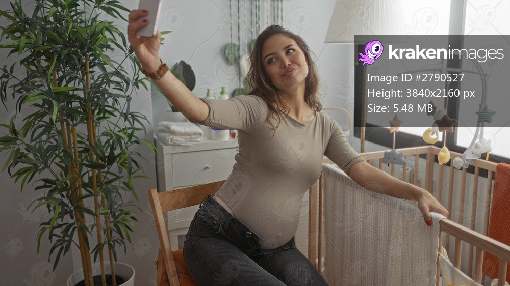 Pregnant woman smiling and taking a selfie in a cozy bedroom adorned with a wooden crib and green plants, embodying happiness and anticipation in a serene home environment. - Kraken Images