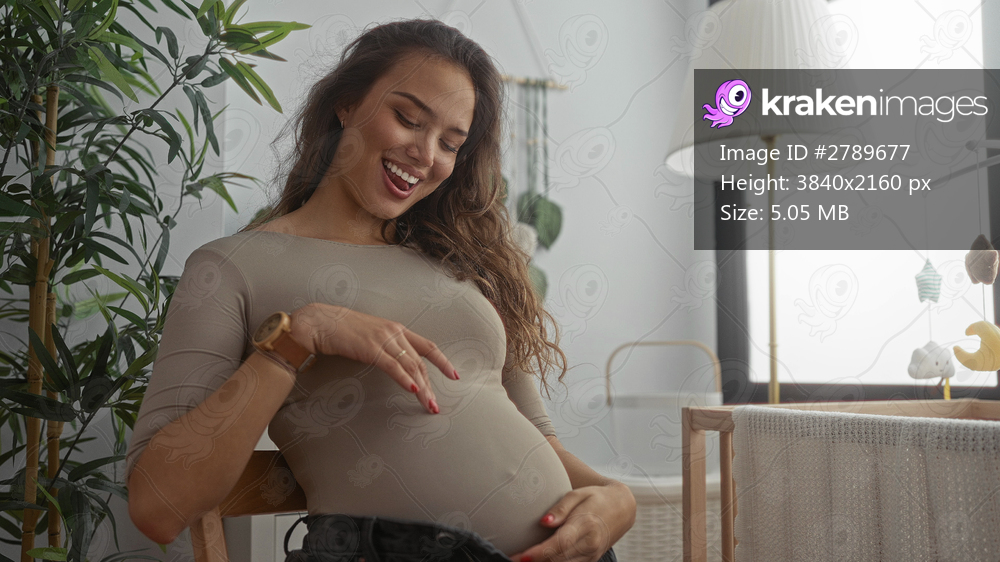 Pregnant woman smiling while gently touching her belly in a cozy bedroom setting surrounded by baby furniture and plants, radiating joy and anticipation for motherhood. - Kraken Images