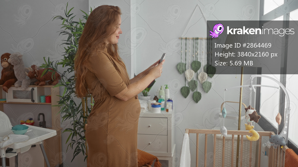 Pregnant woman stands in a softly lit bedroom texting on smartphone while gently cradling her bare belly; maternal serenity.