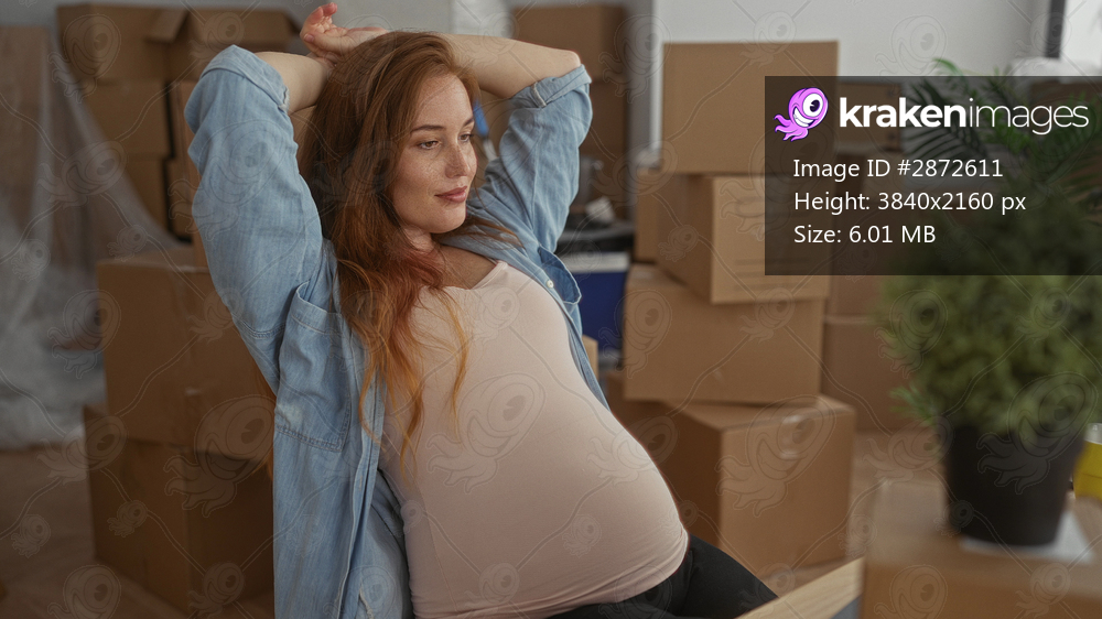 Pregnant woman stretching arms above exposed belly inside new home; comfort anticipation hope relaxation.