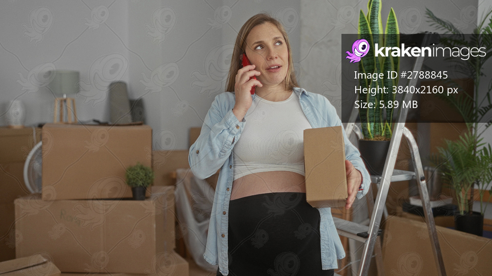 Pregnant woman talking on phone holding box in new home living room surrounded by moving boxes and plants.