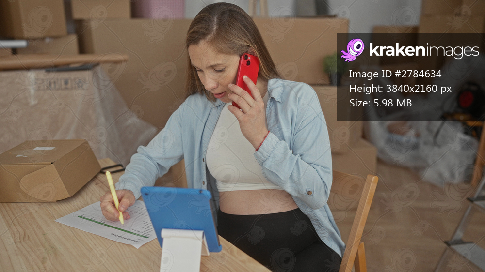 Pregnant woman talking on phone while writing notes on a tablet in a new home setting with moving boxes surrounding her in the living room.