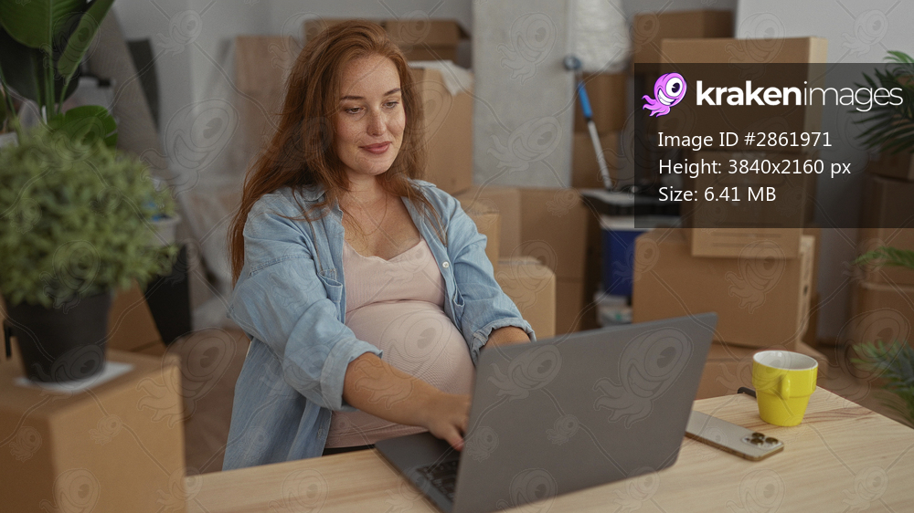 Pregnant woman typing on laptop with exposed belly at a table in a spacious building surrounded by cardboard boxes; anticipation preparation.