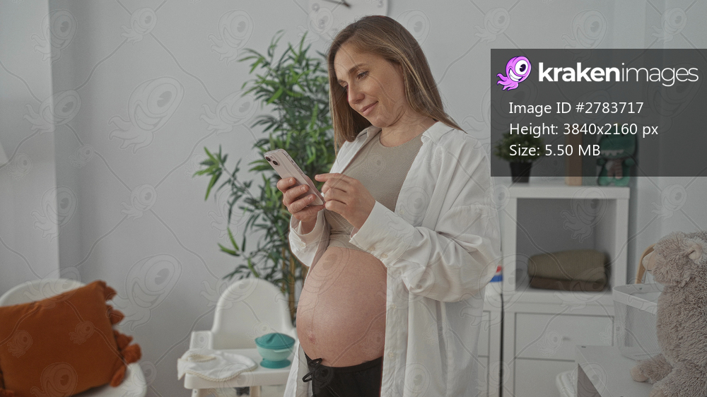 Pregnant woman using smartphone in baby room surrounded by cozy decor and green plants, embodying expectant motherhood and relaxation in a comfortable home environment. - Kraken Images