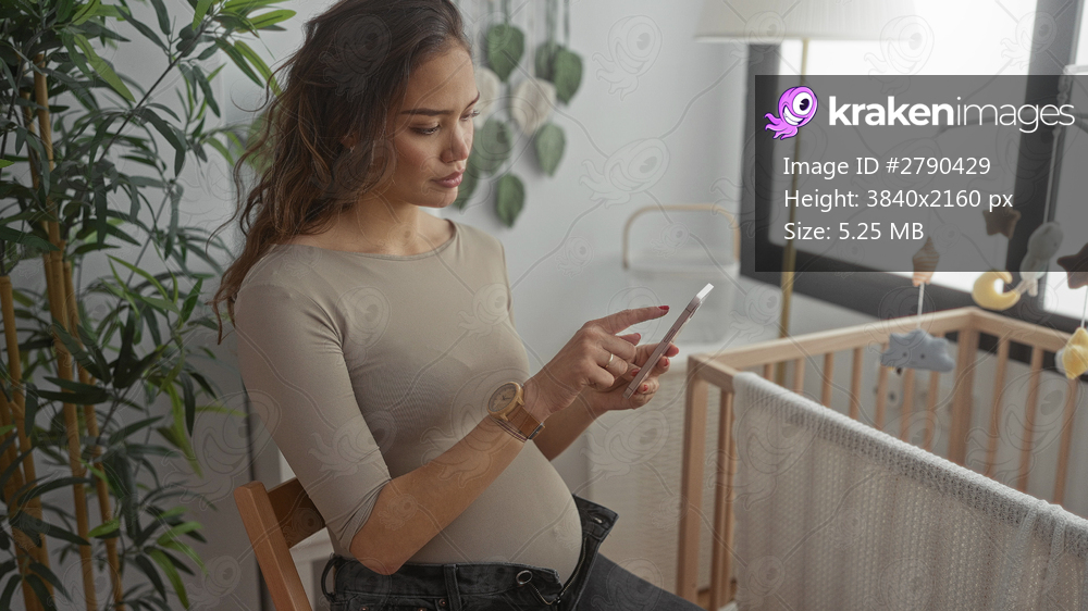 Pregnant woman using smartphone in stylish baby room with crib and plants, showcasing modern motherhood and preparation.