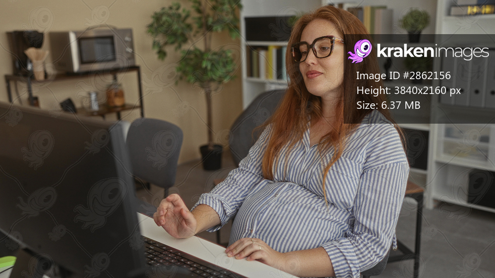 Pregnant woman with visible belly gestures with hand while working at a computer in a modern office; anticipation.