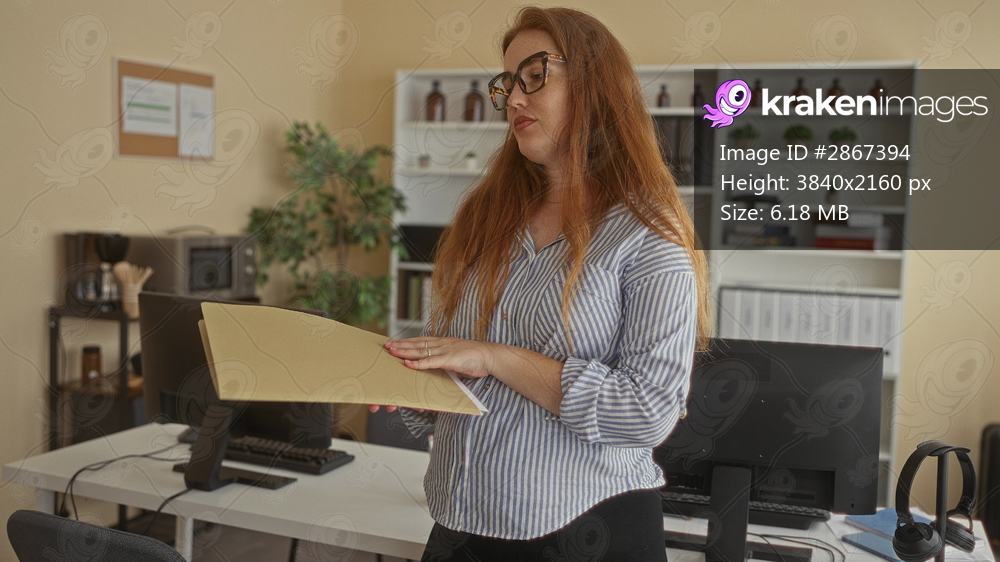 Pregnant woman wearing eyeglasses holds folder and rests hand on belly while standing by desk in office; anticipation.