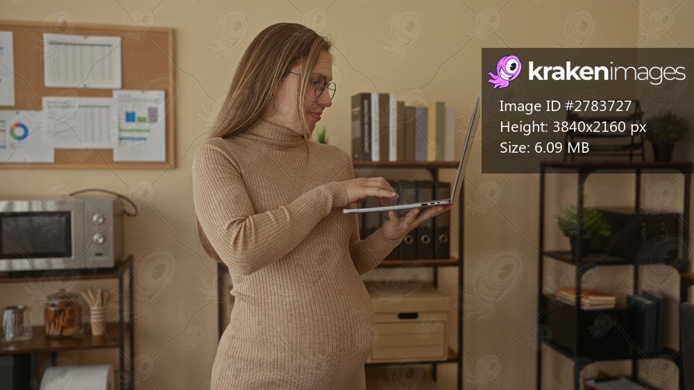 Pregnant woman working on laptop in office setting, surrounded by books, binders, and charts, illustrating modern professional lifestyle.