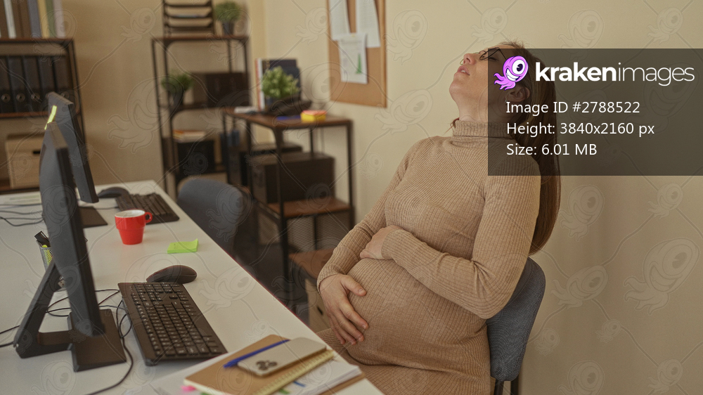 Pregnant woman yawning at office desk, wearing glasses, surrounded by computers and office supplies, suggesting workplace fatigue and maternity experience in indoor setting.