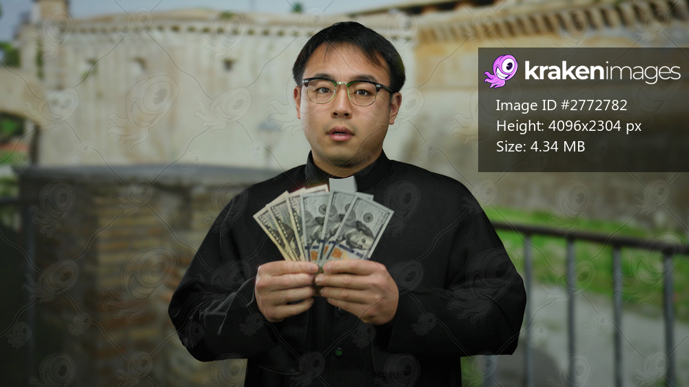 Priest holding american dollars outside a church with historic architecture in the background, showcasing the juxtaposition of modern currency and traditional religion outdoors.