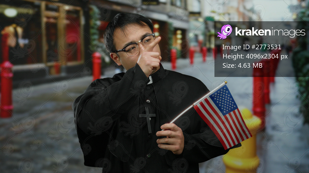 Priest holding american flag on urban street with red bollards and blurred city background, depicting multicultural setting
