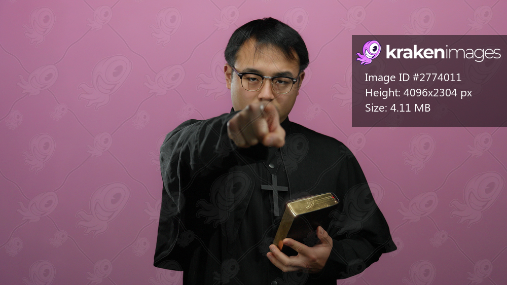 Priest holding bible pointing forward against pink background expressing authority and conviction